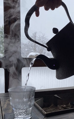 サロンのウエルカムドリンクも発汗前のお白湯もこの鉄瓶から